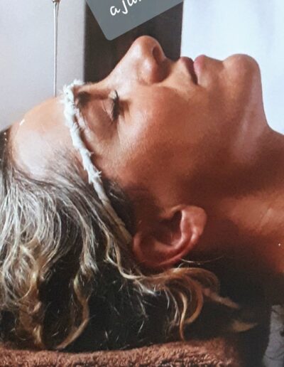 ŠIRODHARA – Při níž se teplý speciální kokosový olej nahřeje a teče jemným pramínkem na čelo, čímž očišťuje mysl i tělo, uvolňuje nervový systém a odbourává stres.